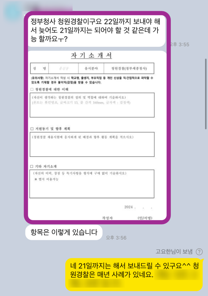 #자기소개서 #자소서 #자기소개서대필 #자소서대필 #자기소개서첨삭 #자소서첨삭 #취업컨설팅 #취업준비 #합격자소서 #대기업자소서 #신입자소서 #공공기관 #공공기관자소서 #공공기관채용 #청원경찰 #자기소개서전문가 #취업성공 #서류합격 #첨삭전문가 #자기소개서의뢰 #취업고민 #기술직자소서#생산직자소서#채용공고#자소서예시#자소서대행#자기소개서대행#자소서항목#자기소개서문항#합격후기#이력서#경력기술서#직무수행계획서#연봉#자소서쓰는법#자기소개서쓰는법#사람인#잡코리아#자소설닷컴#자유양식