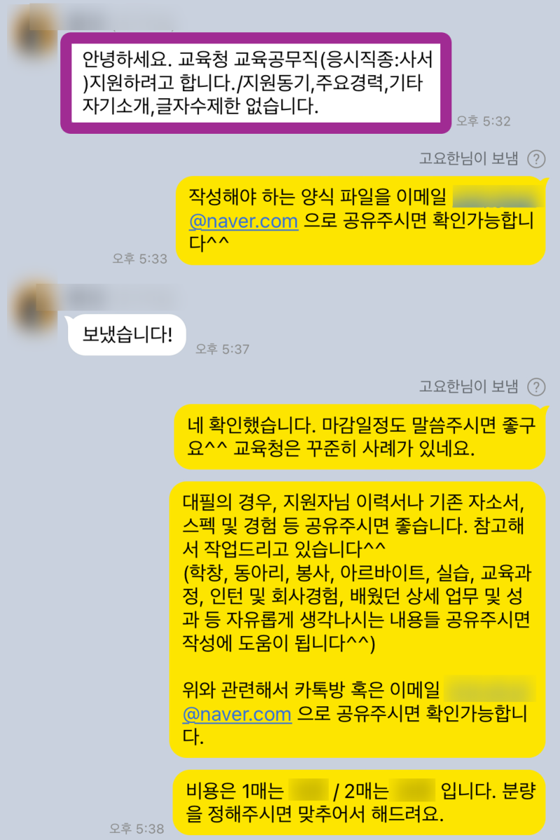 >> 이력서 및 자기소개서 초안 작성/첨삭: 제가 직접 초안을 작성하거나, 지원자님의 초안을 기반으로 교육공무직 인재상에 맞춰 밀도 높은 첨삭을 진행합니다. ✨