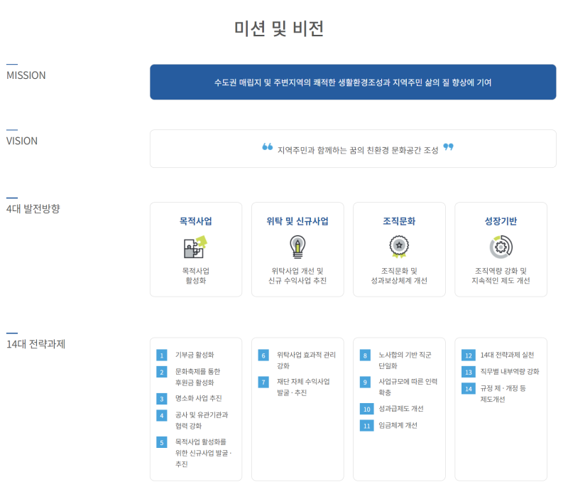 - ✔ 핵심가치: 환경 보전, 문화예술 진흥, 지역사회 공헌, 소통과 협력, 혁신적 사고