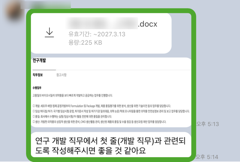 특히 바이오 산업의 특성상 정확성, 꼼꼼함, 책임감이 매우 중요하다고 판단, 이러한 가치들이 지원자분의 강점으로 드러날 수 있도록 문장을 다듬고 스토리를 재구성했습니다. 삼성바이오에피스의 인재상인 ‘최고 지향’, ‘전문성’, ‘도전 정신’에 맞춰 지원자분의 경험을 재해석하는 작업도 잊지 않았습니다. 덕분에 지원자분께서도 ‘와, 제 경험이 이렇게 멋진 이야기로 바뀔 수 있다니!’ 하며 깜짝 놀라셨어요! 😊
