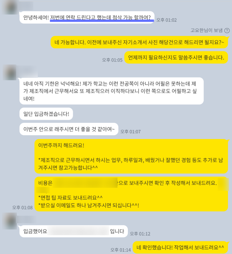 현재까지 수백 건의 대기업, 공기업, 중견기업, 중소기업, 공무직 등 다수의 합격을 바탕으로 1. 취업 자기소개서 첨삭 및 대행 2. 학업계획서 3. 경력기술서 및 직무수행계획서 진행 4. 면접컨설팅을 진행하고 있습니다! 여러분의 소중한 취업 준비, 제가 함께하겠습니다. 언제든지 편하게 문의 주세요! 😊