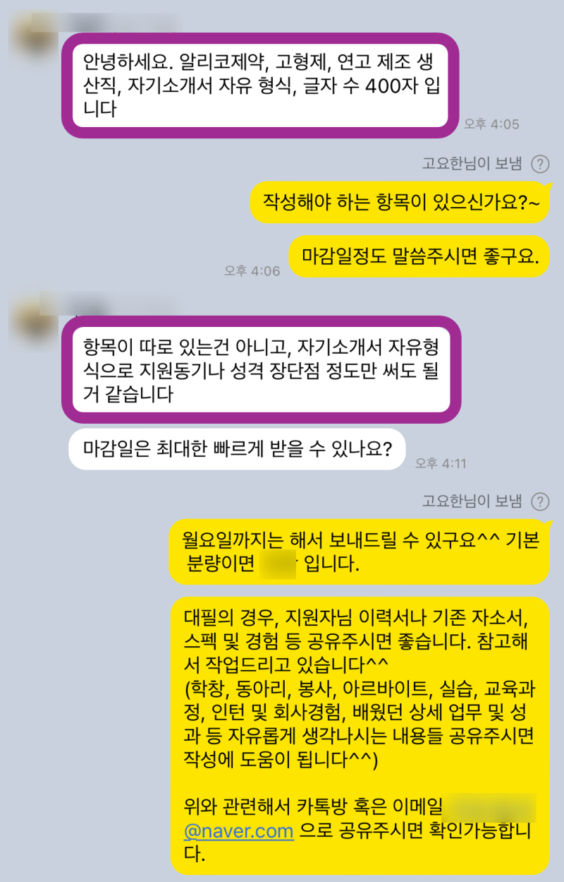 - >> 4단계: 자기소개서 초안 작성 및 1차 첨삭본 전달: 제가 직접 정성껏 작성하거나, 지원자분 글을 기반으로 첨삭해 드려요.