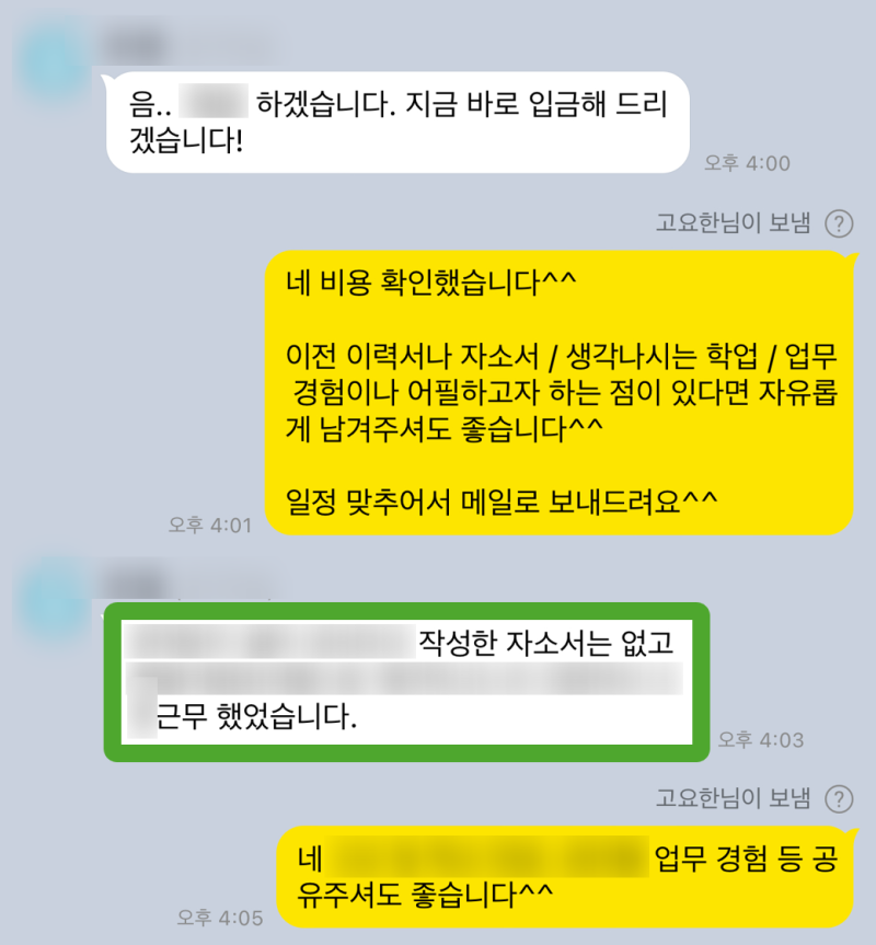 - >> 초안/이력서 전달 (혹은 작성 경험이 없는 경우 이력서 대행 진행)
