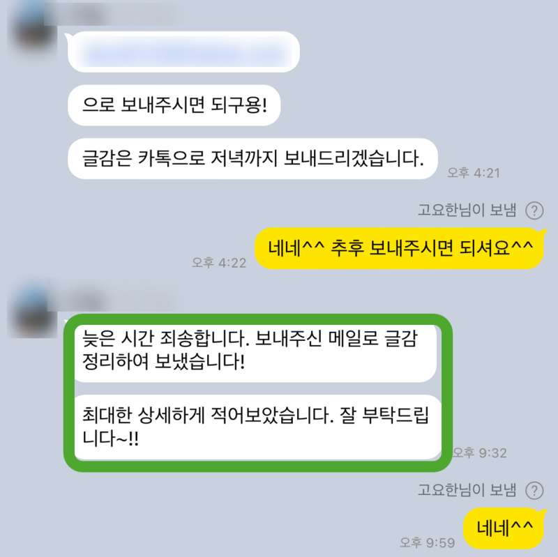 저의 취업 컨설팅은 1. 자기소개서 첨삭 및 대행, 2. 학업계획서, 3. 경력기술서 및 직무수행계획서 진행, 4. 면접 컨설팅까지 원스톱으로 제공됩니다! 🎁 채용공고 분석, 자소서 작성 방법 및 문항 분석까지 꼼꼼하게 도와드리니, 혼자 고민하지 마시고 언제든 편하게 문의해주세요! 📞 합격의 기쁨, 제가 함께 만들어 드릴게요! 😊