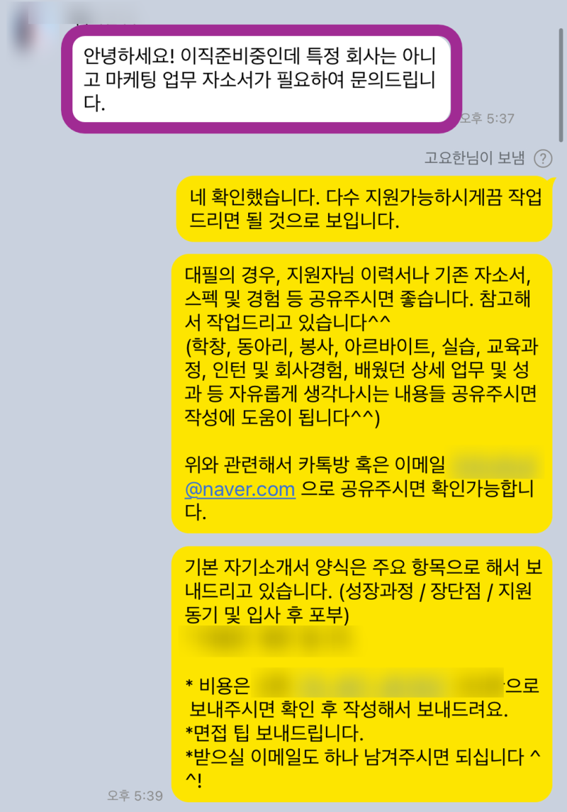 이번 지원자분은 생산직 분야에 지원하신 30대 초반의 남성분이셨습니다. 이전 회사에서 3년 정도 생산직 업무를 담당하셨지만, 자기소개서 작성에 어려움을 느껴 저에게 도움을 요청하셨습니다.