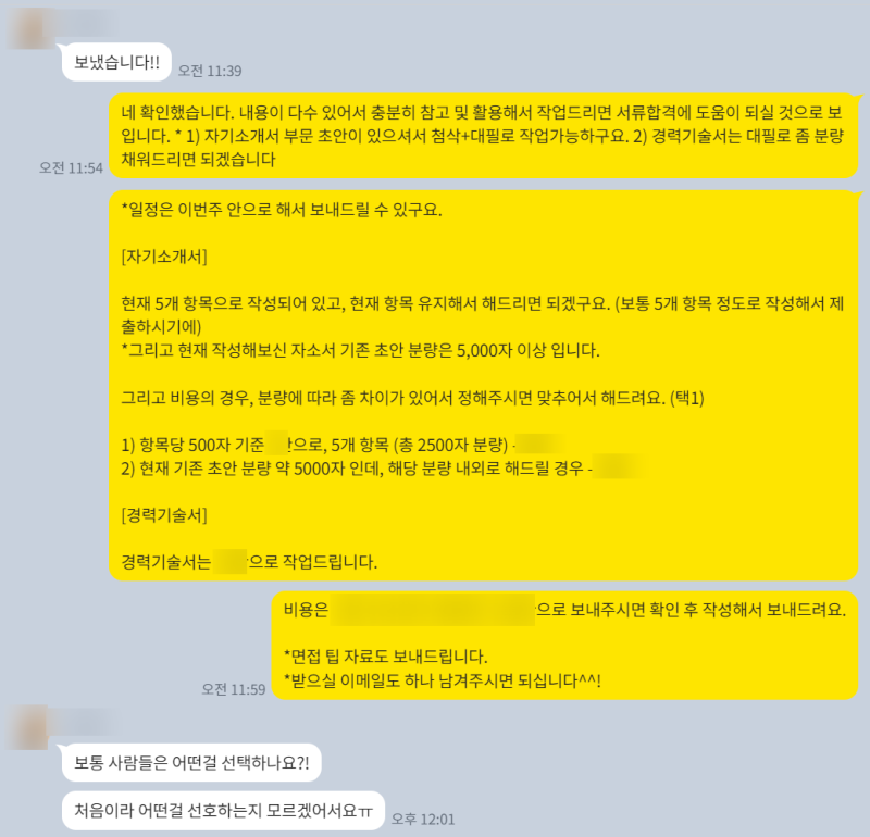 저의 자기소개서 첨삭 및 대행 서비스는 아래와 같은 과정으로 진행됩니다!