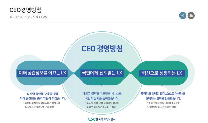 LX는 국민을 위한 공간정보 플랫폼 기관을 지향하며, ‘공간정보로 더 나은 삶을 만드는 기관’이라는 비전을 가지고 있어요.