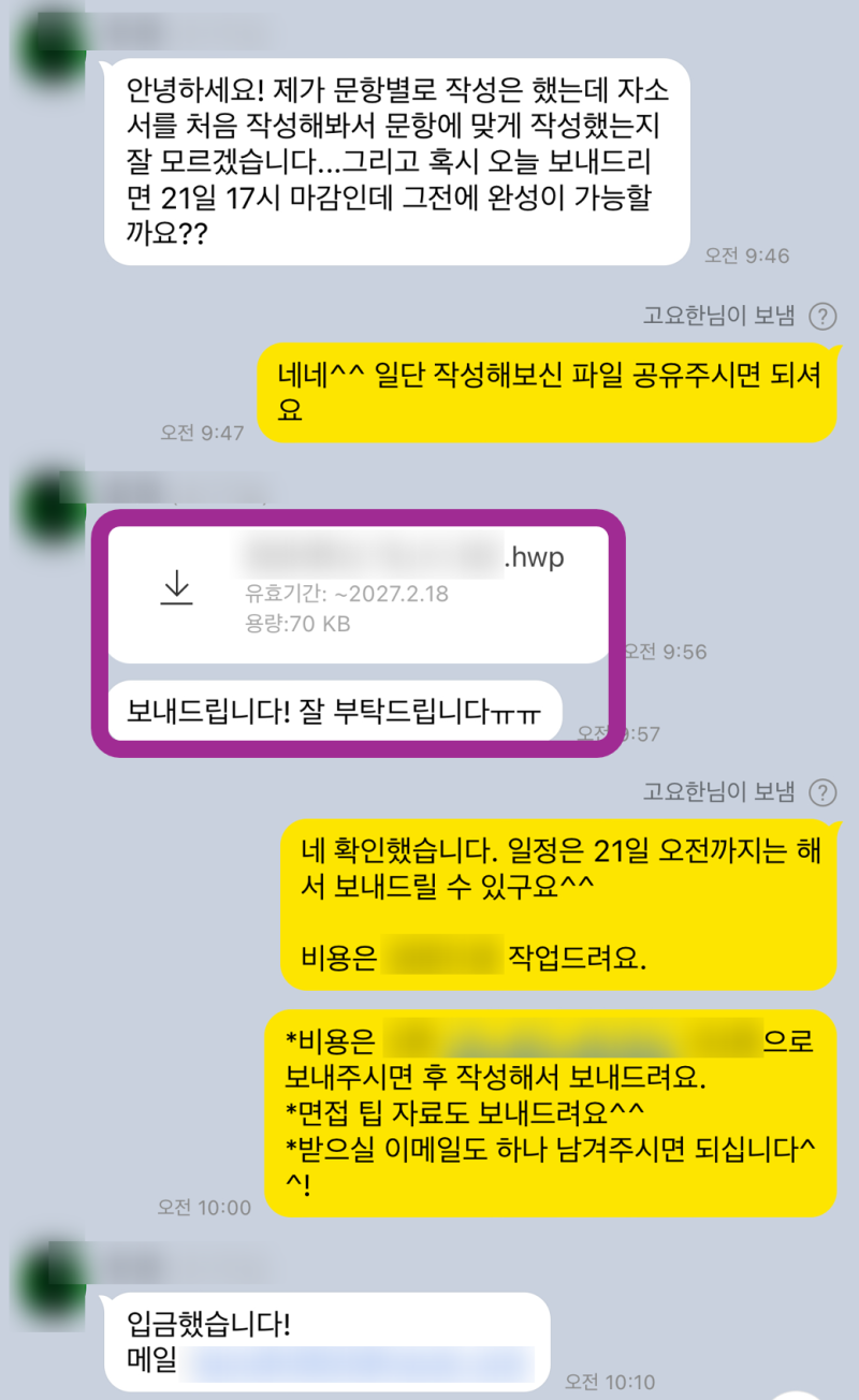 자기소개서 작성, 막막하고 어려우셨나요? 혼자 고민하지 마세요! 📝 수많은 합격 사례가 증명하는 저의 노하우로 여러분의 합격 문을 활짝 열어드리겠습니다! 취업 자기소개서 첨삭 및 대행부터 경력기술서, 직무수행계획서, 면접 컨설팅까지! 여러분의 성공적인 취업을 위해 제가 가진 모든 경험과 노하우를 아낌없이 공유해 드릴게요. 언제든 편하게 문의주세요! 😊