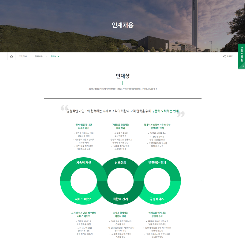 인재상: 변화와 혁신을 선도하는 인재, 고객 가치를 최우선으로 생각하는 인재, 협력과 상생을 통해 시너지를 창출하는 인재, 최고를 지향하며 끊임없이 도전하는 인재